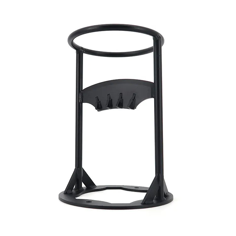 Stativet har en stabil botten med hål, vilket gör det enkelt att fästa på en stubbe eller annat lämpligt underlag med spik eller skruv. På så sätt står det stadigt och ger dig en trygg arbetsyta.