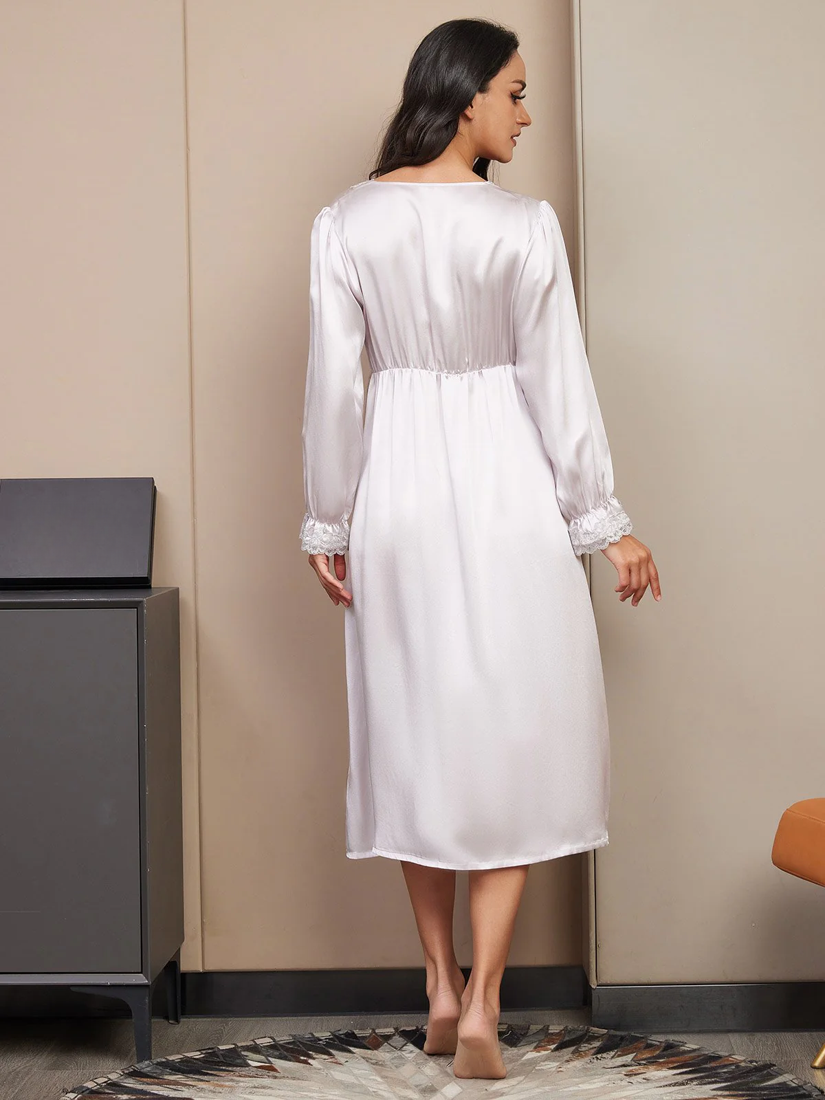Detta lyxiga nattlinne i siden är en perfekt kombination av elegans och komfort. De sofistikerade spetsdetaljerna och de långa ärmarna gör detta nattlinne inte bara fantastiskt utan också extremt bekvämt. Det mjuka sidentyget omfamnar dig med en delikat touch, vilket gör att du känner dig sexig och självsäker hela natten lång. Denna nattklänning är perfekt för en lyxig kväll för dig själv eller som en förtrollande present till någon speciell.