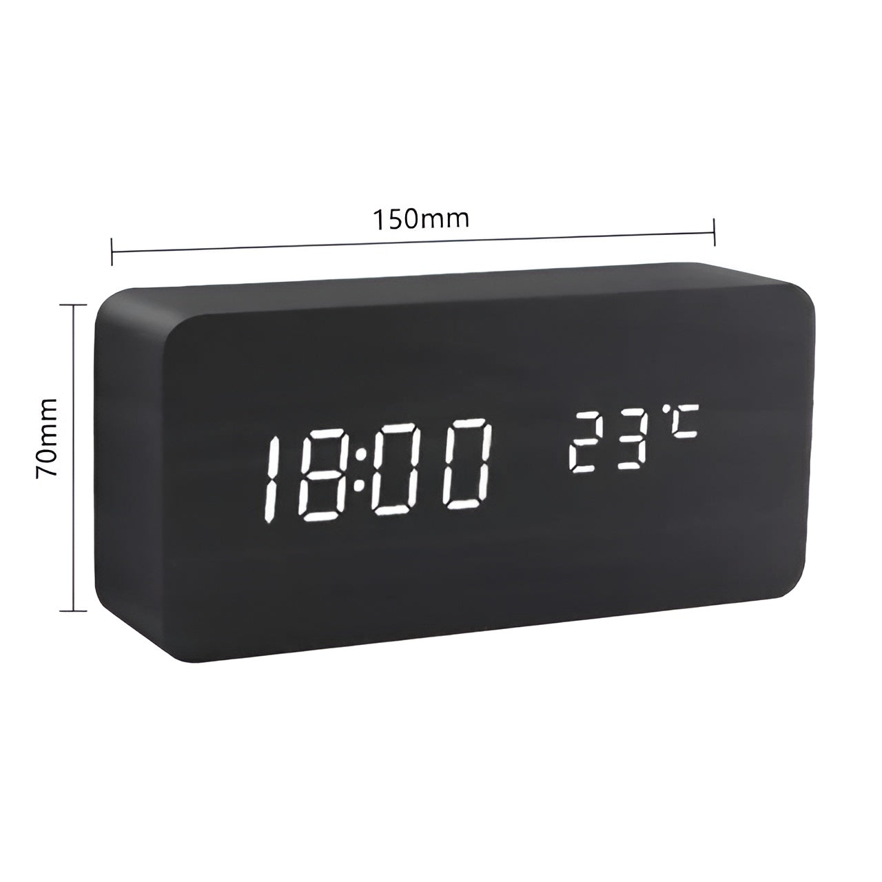 Med Trä-LED-klocka får du stil och funktionalitet i ditt sovrum, vardagsrum eller kontor! Denna eleganta träklocka är inte bara en väckarklocka, utan också en praktisk LED-display som visar tid, datum och inomhustemperatur. Njut av det varma, naturliga träutseendet kombinerat med modern LED-teknik som harmoniskt smälter in i varje interiör.