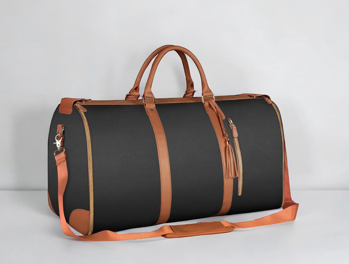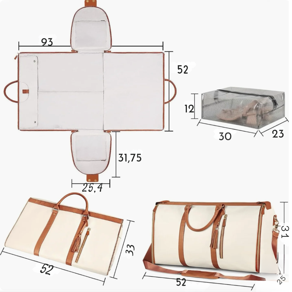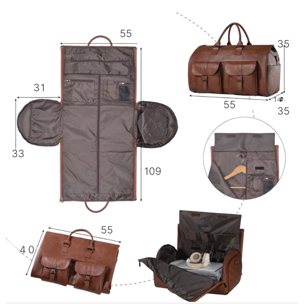 Med en innovativ 2-i-1-design som kombinerar funktionerna av en plaggväska och en duffelväska är denna reseväska idealisk för moderna resenärer som är ständigt på språng. Dess generösa interiör erbjuder tillräckligt med utrymme för alla dina nödvändigheter och är utrustad med tre tillbehörsfickor för smidig organisation. Den vattentåliga ytan och de säkra dragkedjorna garanterar skydd och säkerhet för dina tillhörigheter, medan den justerbara axelremmen ger bekväm transport oavsett resans destination.