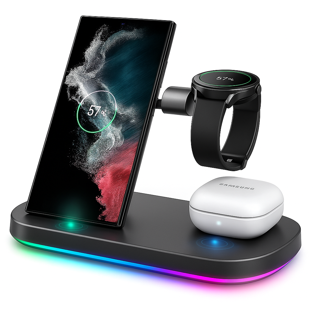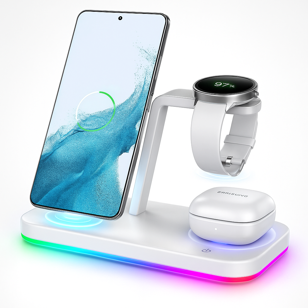Uppgradera din setup med denna drahtlös laddare som laddar din telefon, smartklocka och hörlurar samtidigt. Dess släta och kompakta design passar perfekt på ditt skrivbord eller nattduksbord, vilket minskar kabeltrassel samtidigt som den levererar snabb och pålitlig drahtlös laddning. Idealisk för hemmet, kontoret eller resor, håller denna laddare dina viktiga enheter redo att gå.