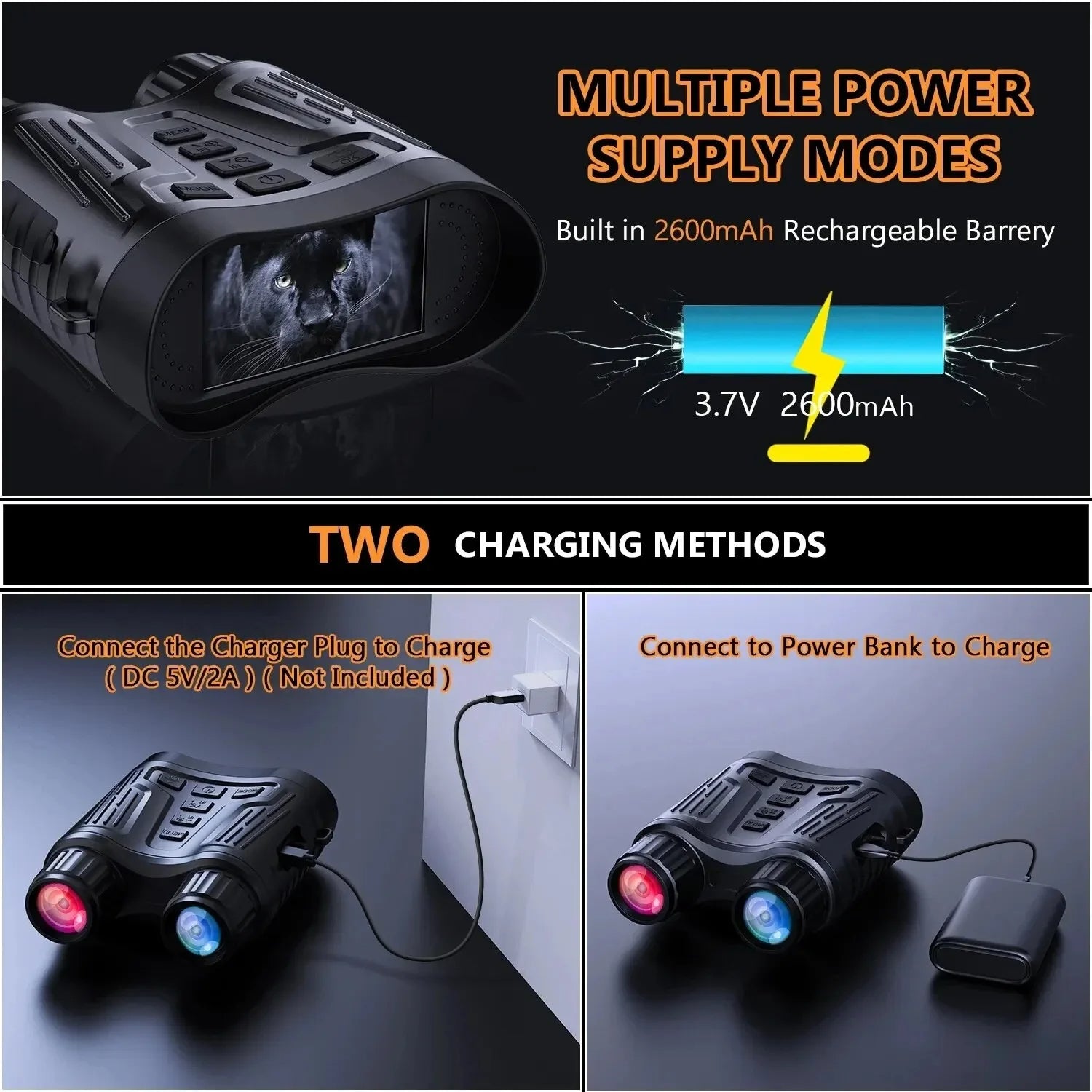 Med ett inbyggt 2600mAh uppladdningsbart batteri erbjuder kikarna upp till 13 timmar av kontinuerlig användning utan IR och 6 timmar med IR. Den bekväma Type-C-laddningsporten säkerställer snabb laddning, vilket gör den idealisk för långa utomhusäventyr utan behov av frekventa batteribyten.