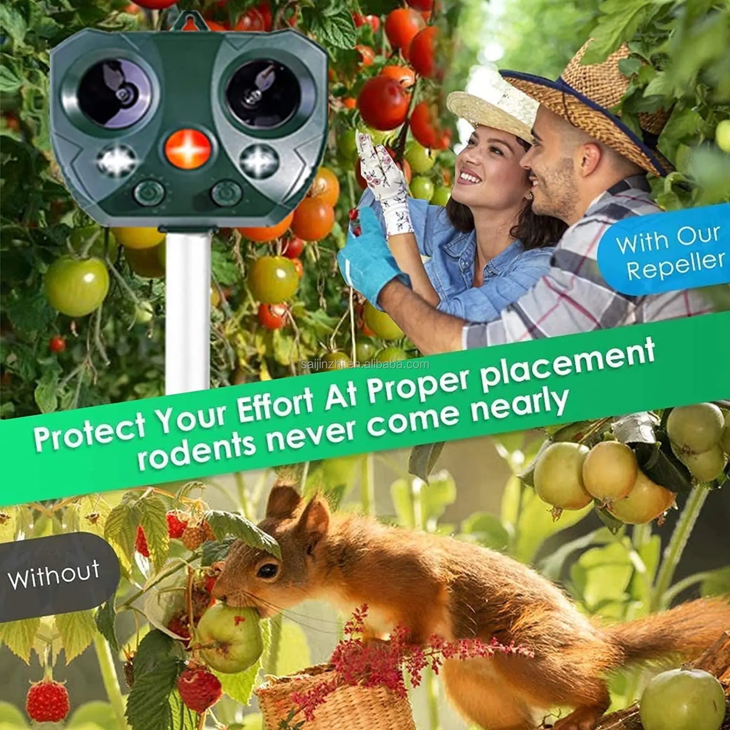 Utrustad med en PIR rörelsesensor och dubbel ultraljudsspeaker avger denna avskräckare variabel-frekvens ljudvågor och LED blinkande lampor för att skrämma bort fåglar, ekorrar, tvättbjörnar och andra djur. De oregelbundna frekvenserna gör den mycket effektiv – även för djur som har anpassat sig till standardavskräckare.