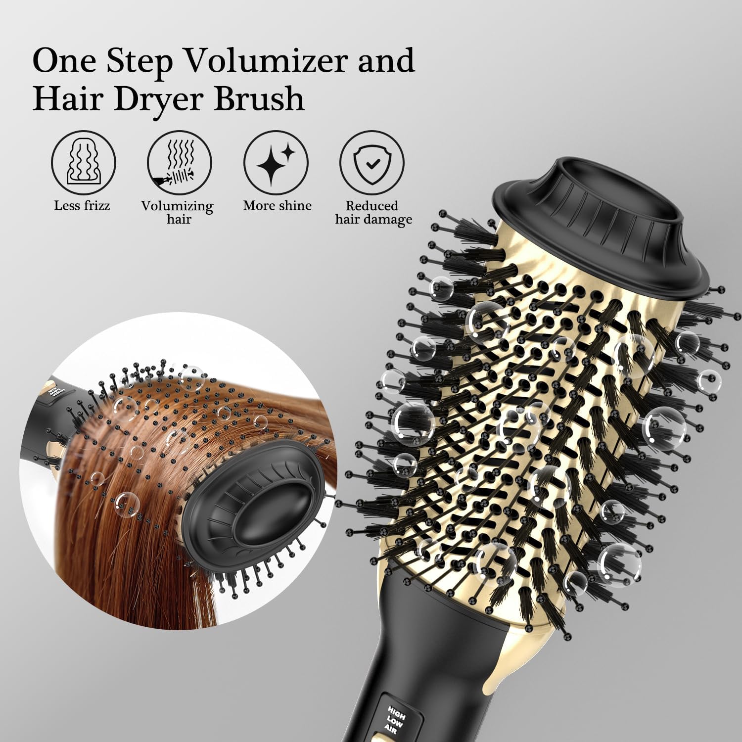 Få salongskvalitetsresultat hemma med denna allt-i-ett varmluftsborste och hårvolymgivare. Designad för att kombinera torkning, lockning och volumisering i ett steg, hjälper detta mångsidiga hårstylingsverktyg dig att skapa mjuka lockar, släta vågor och fyllig volym utan ansträngning. Dess stiliga svarta och gyllene finish ger en touch av elegans till din dagliga rutin, vilket gör hårstyling snabbare och enklare.